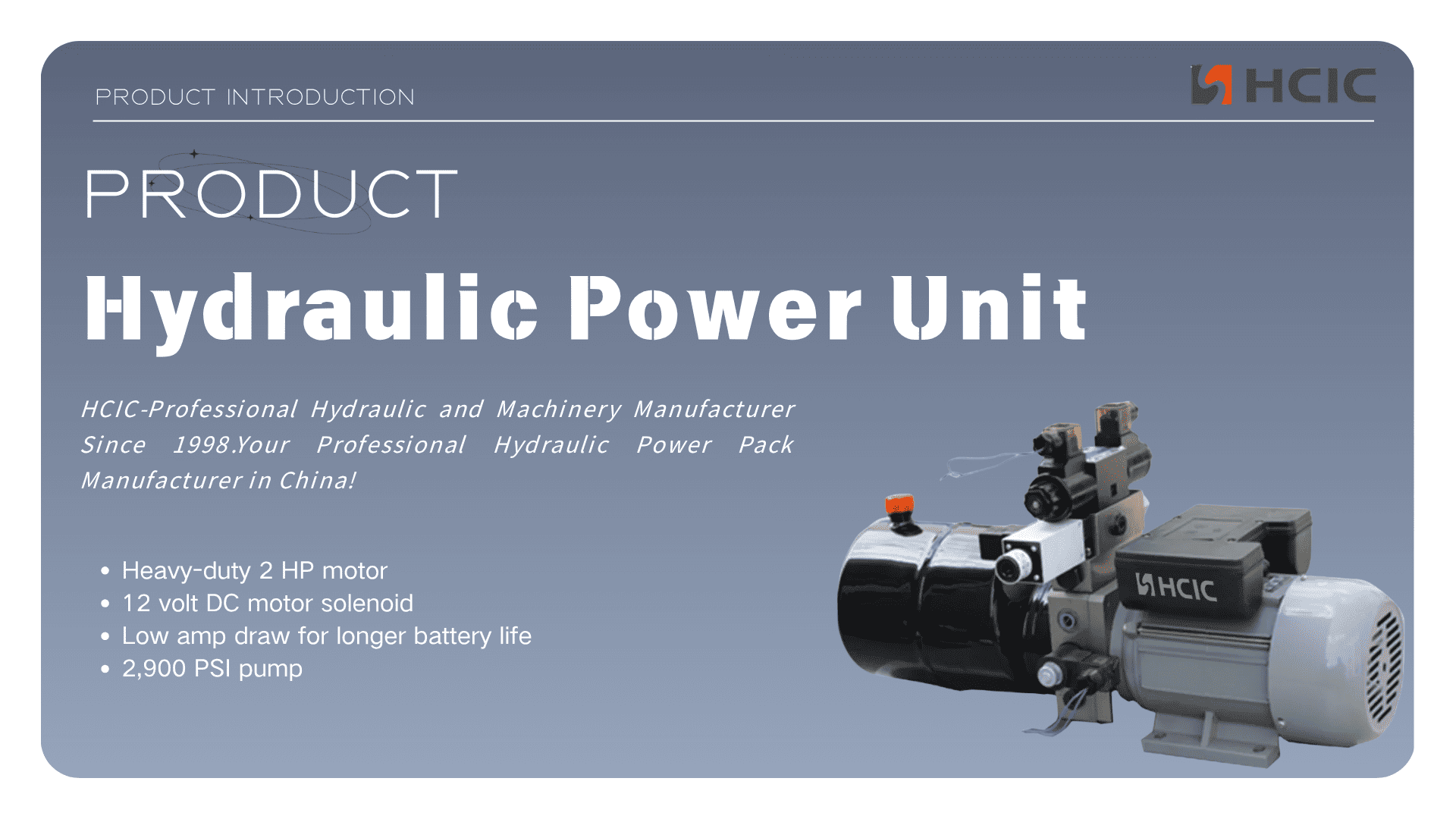 HCIC 12V Hydraulic Power Unit – 2,1cc slagvolym, 2HP motor, 2900PSI pump, 40lbs lättvikt, lågt amperedrag för lång batteritid, perfekt för DC hydraulsystem.